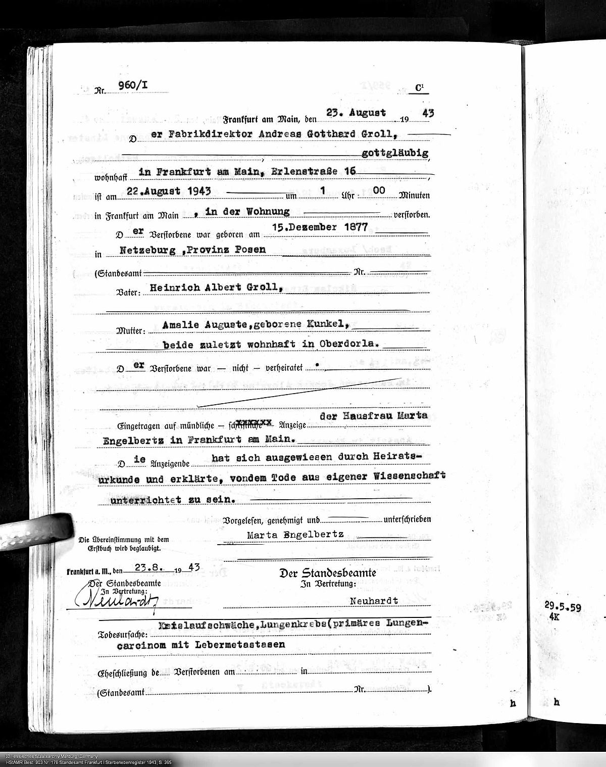 Sterbeurkunde Nr. 960/1943 Standesamt Frankfurt am Main I
