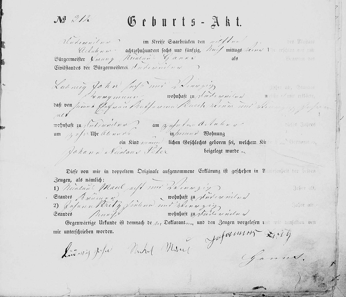 Quelle: Geburtsregister Nr. 312/1856 Zivilstandsregister Dudweiler