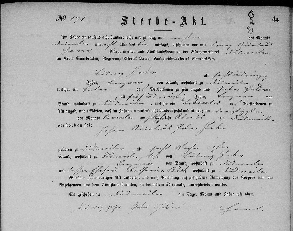 Sterberegister Nr. 171/1856 Zivilstandsregister Dudweiler