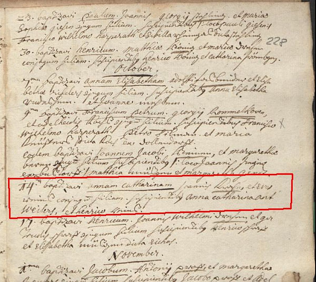 Quelle: Taufe Kirchenbuch Seite 228 des Jahres 1714 in der katholischen Kirche St. Johann Baptist zu Honnef