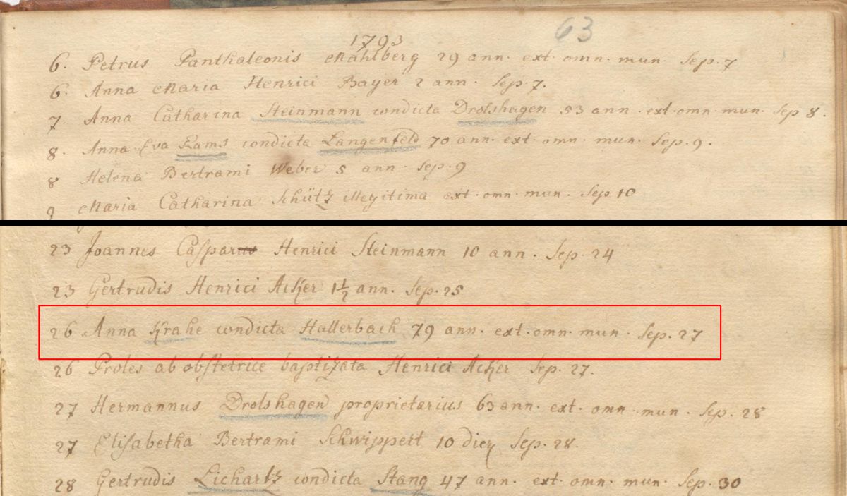 Sterbeeintrag Kirchenbuch Seite 63 des Jahres 1793 der katholischen Kirche St. Johann Baptist zu Honnef