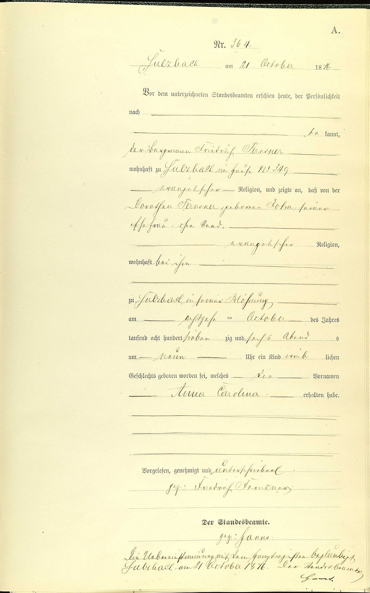 Quelle: Geburtsregister Nr. 364/1876 Standesamt Sulzbach