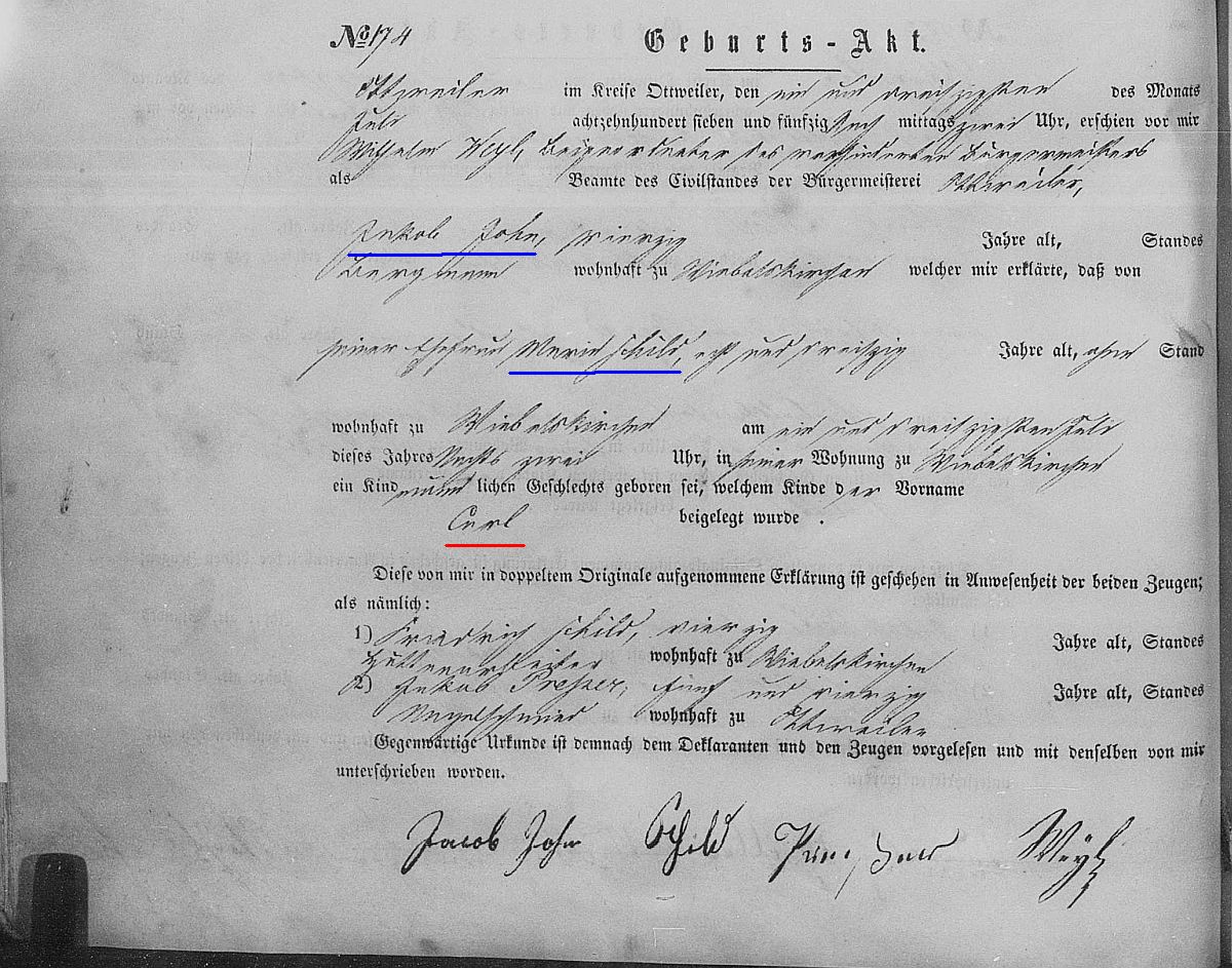 Quelle: Geburtsregister Nr. 174/1857 Zivilstandsregister Ottweiler