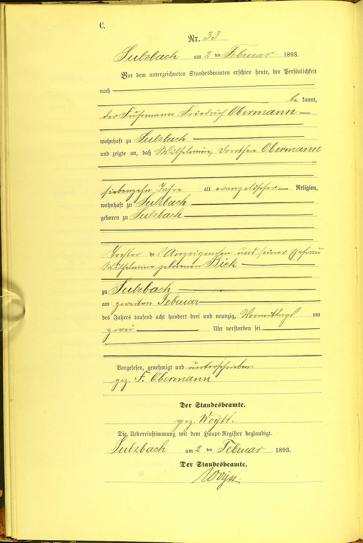 Sterberegister Nr. 33/1893 Standesamt Sulzbach