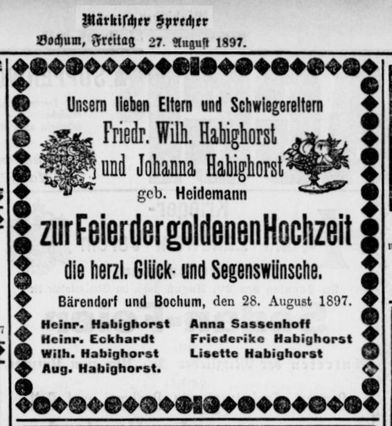 Quelle: Zeitungsannonce zur goldenen Hochzeit "Märkischer Sprecher" vom 27.08.1897