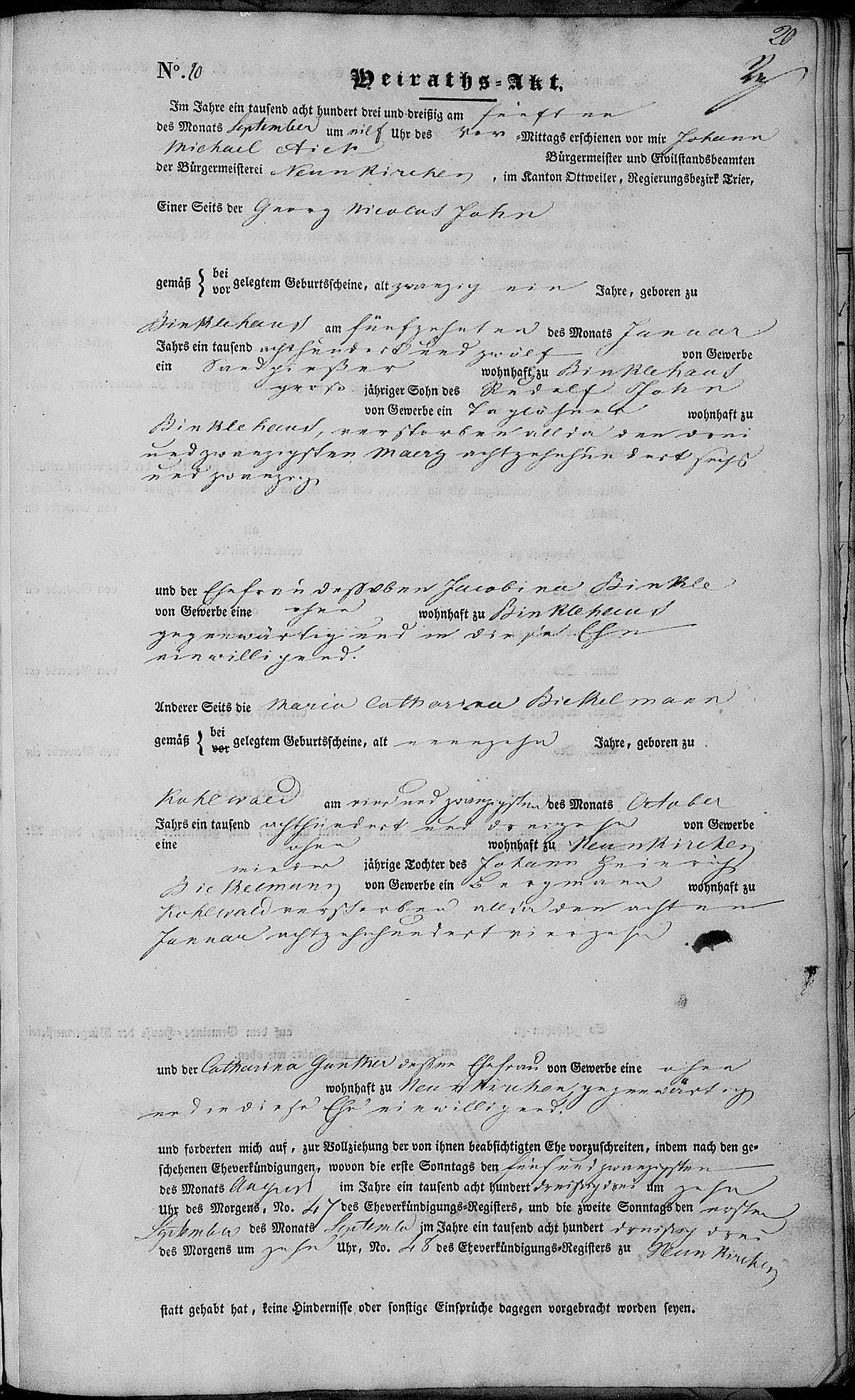 Heiratsregister Nr. 20/1833 Zivilstandsregister Neunkirchen