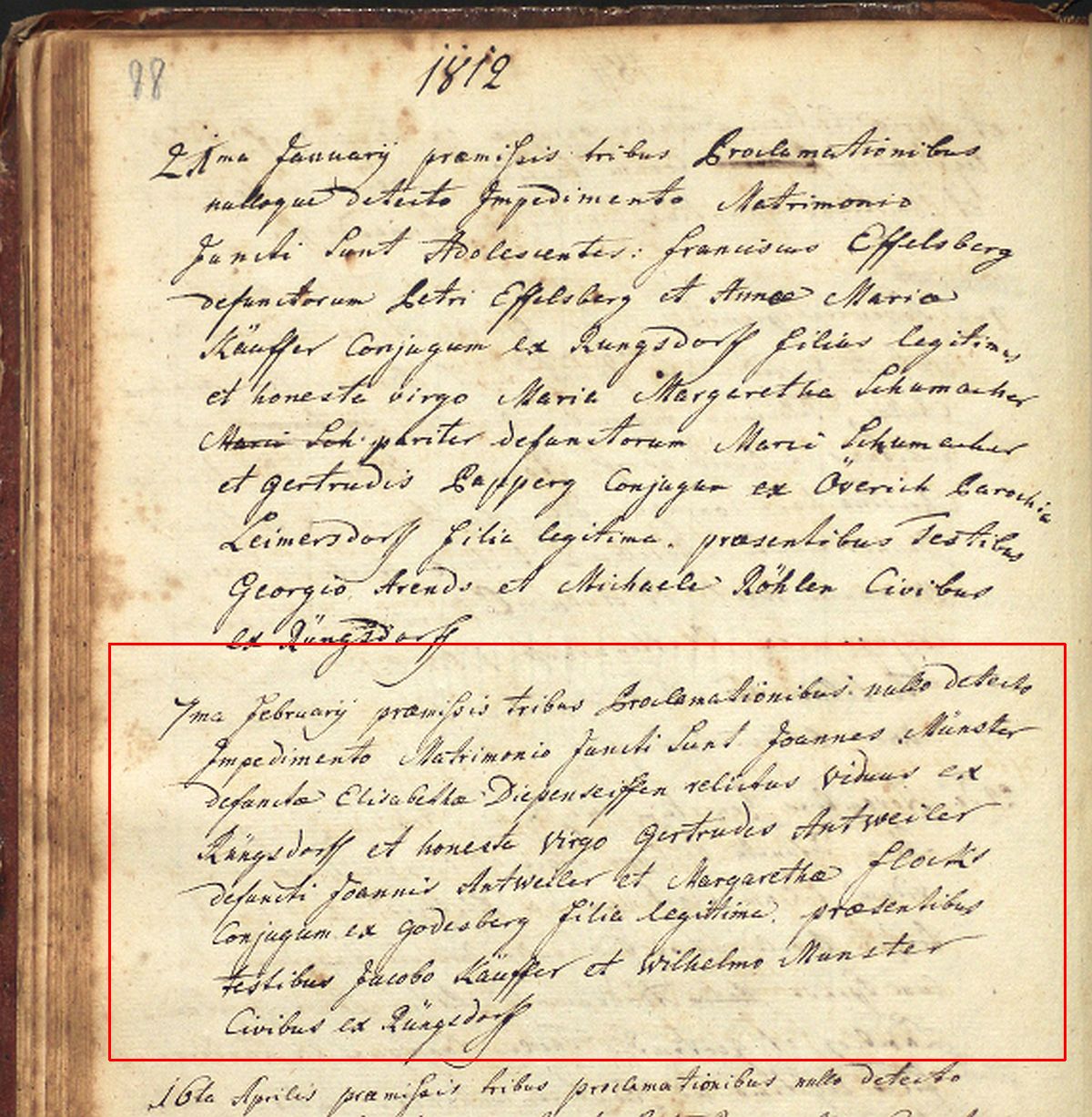 Trauung Kirchenbuch Seite 88 des Jahres 1812 in der katholischen Kirche St. Andreas zu Rüngsdorf.