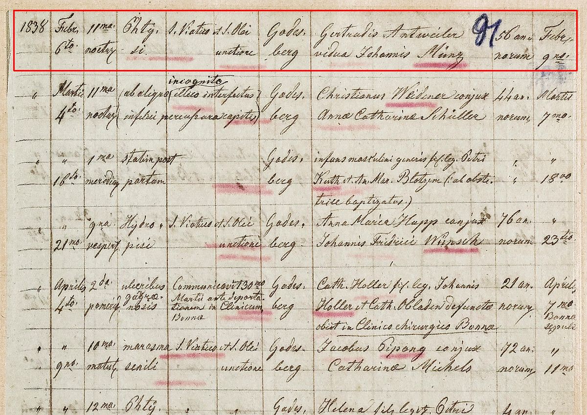 Sterbeeintrag Kirchenbuch Seite 97 des Jahres 1838 in der katholischen Kirche St. Marien zu Godesberg.