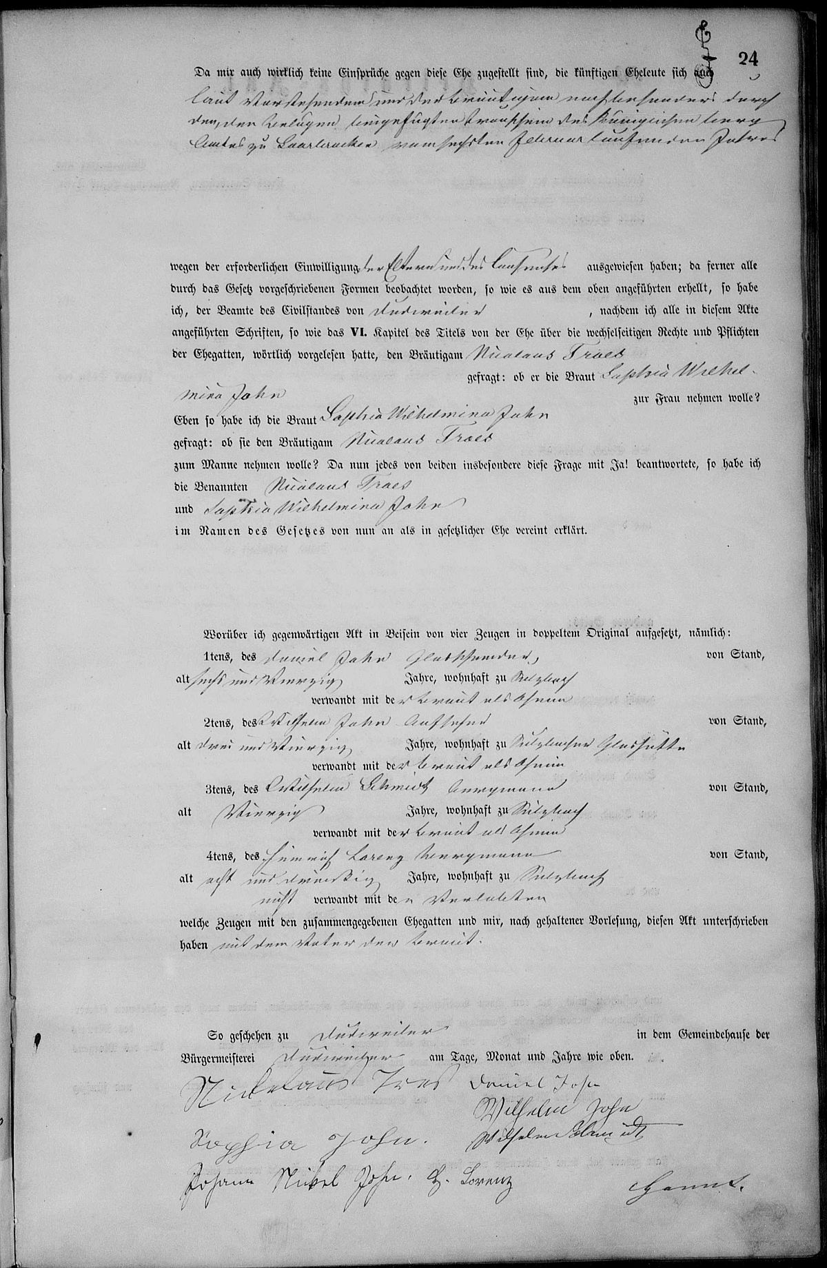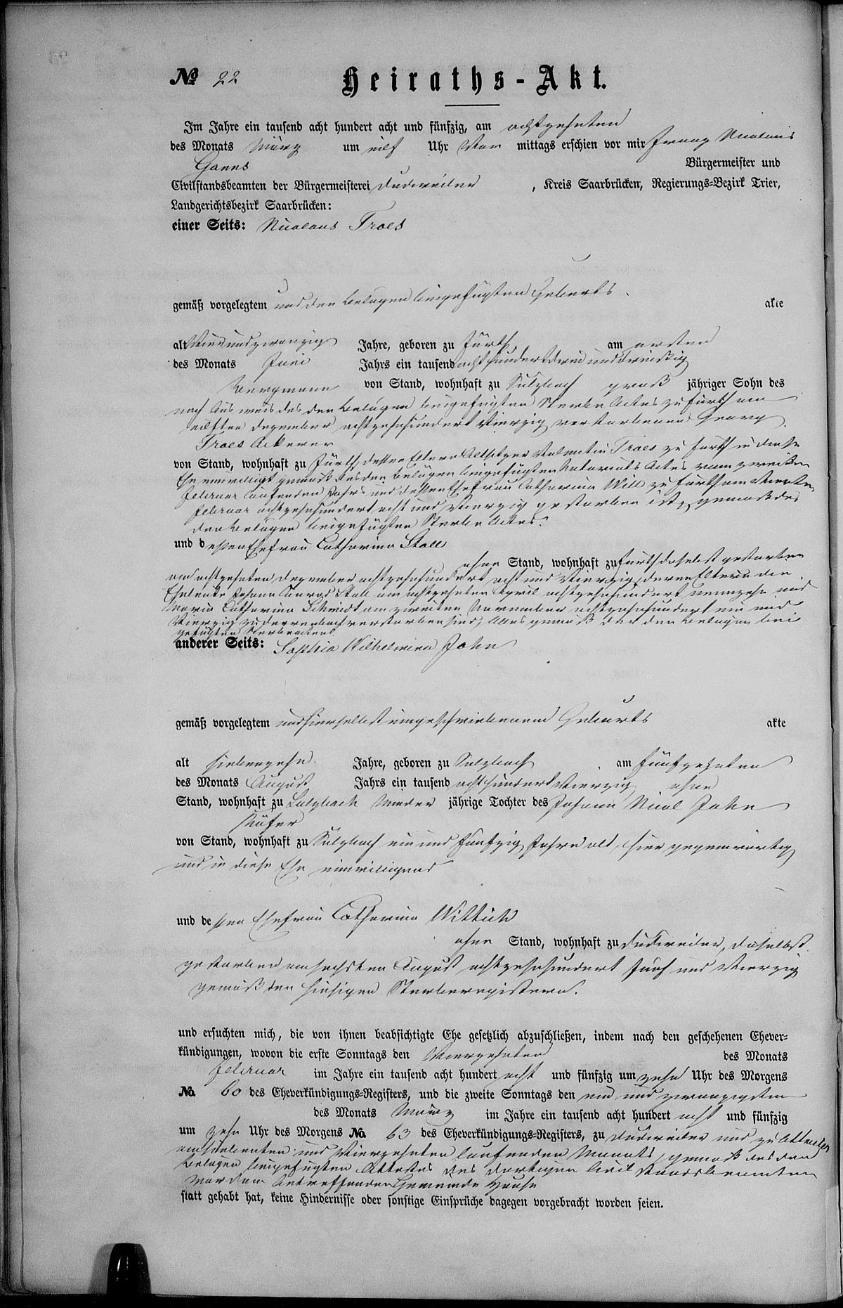 Quelle: Heiratsregister Nr. 22/1858 Zivilstandsregister Dudweiler