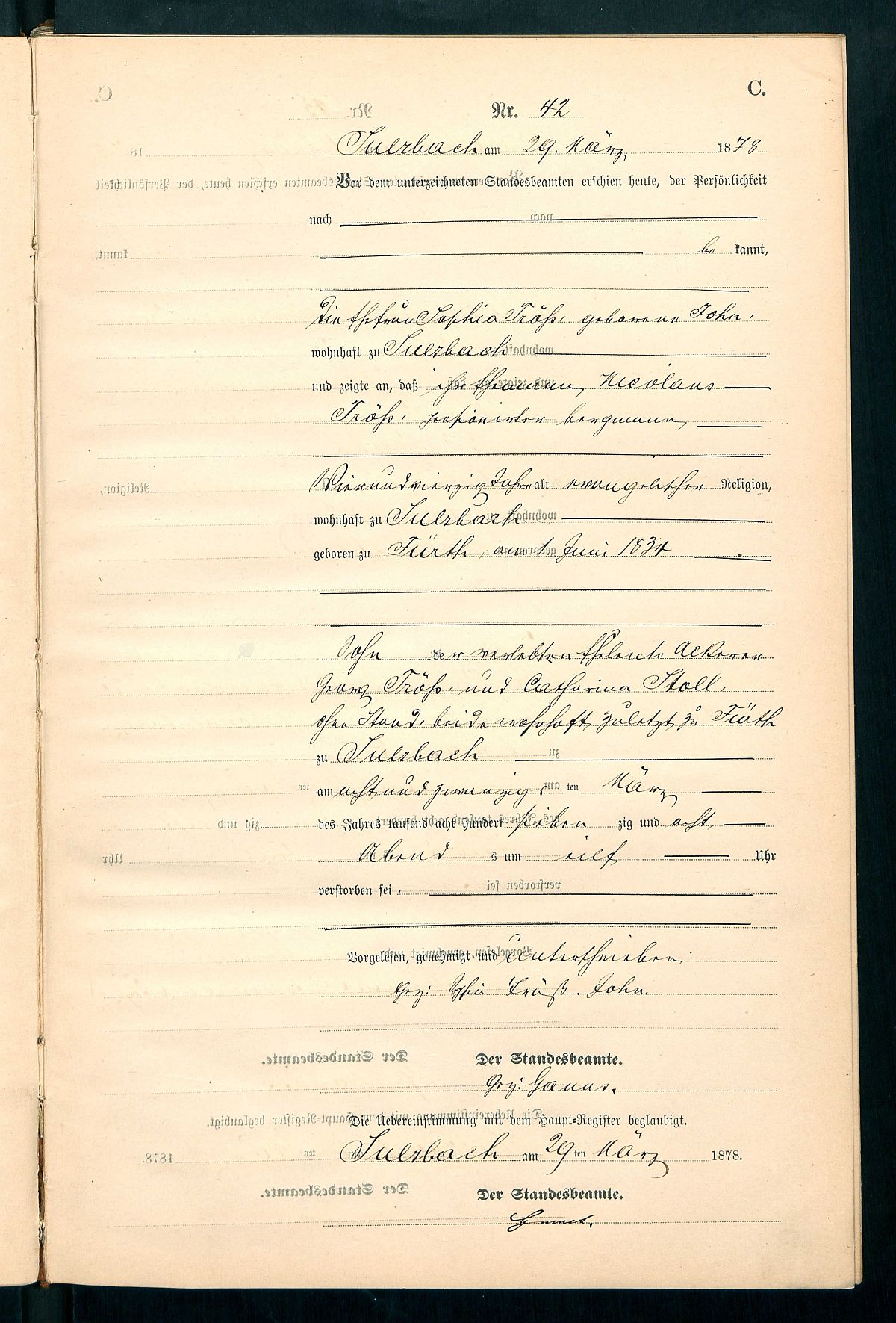 Sterbeurkunde Nr. 42/1878 Standesamt Sulzbach