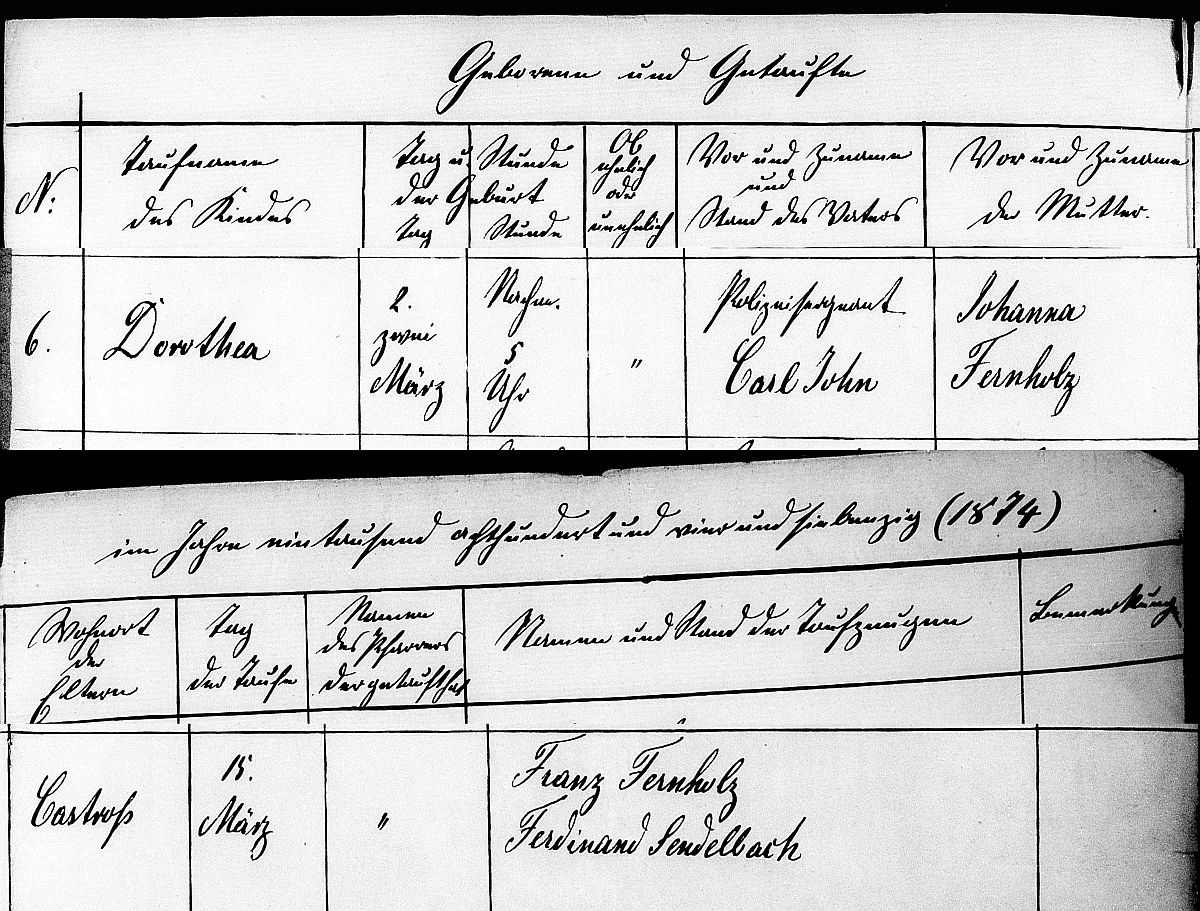 ~ 15.03.1874 Castrop, ev. luth. Stadtgemeinde, Taufpaten: Franz Fernholz und Ferdinand Sendelbach (Stiefgroßvater)