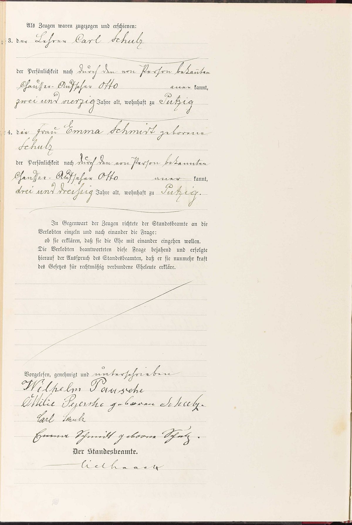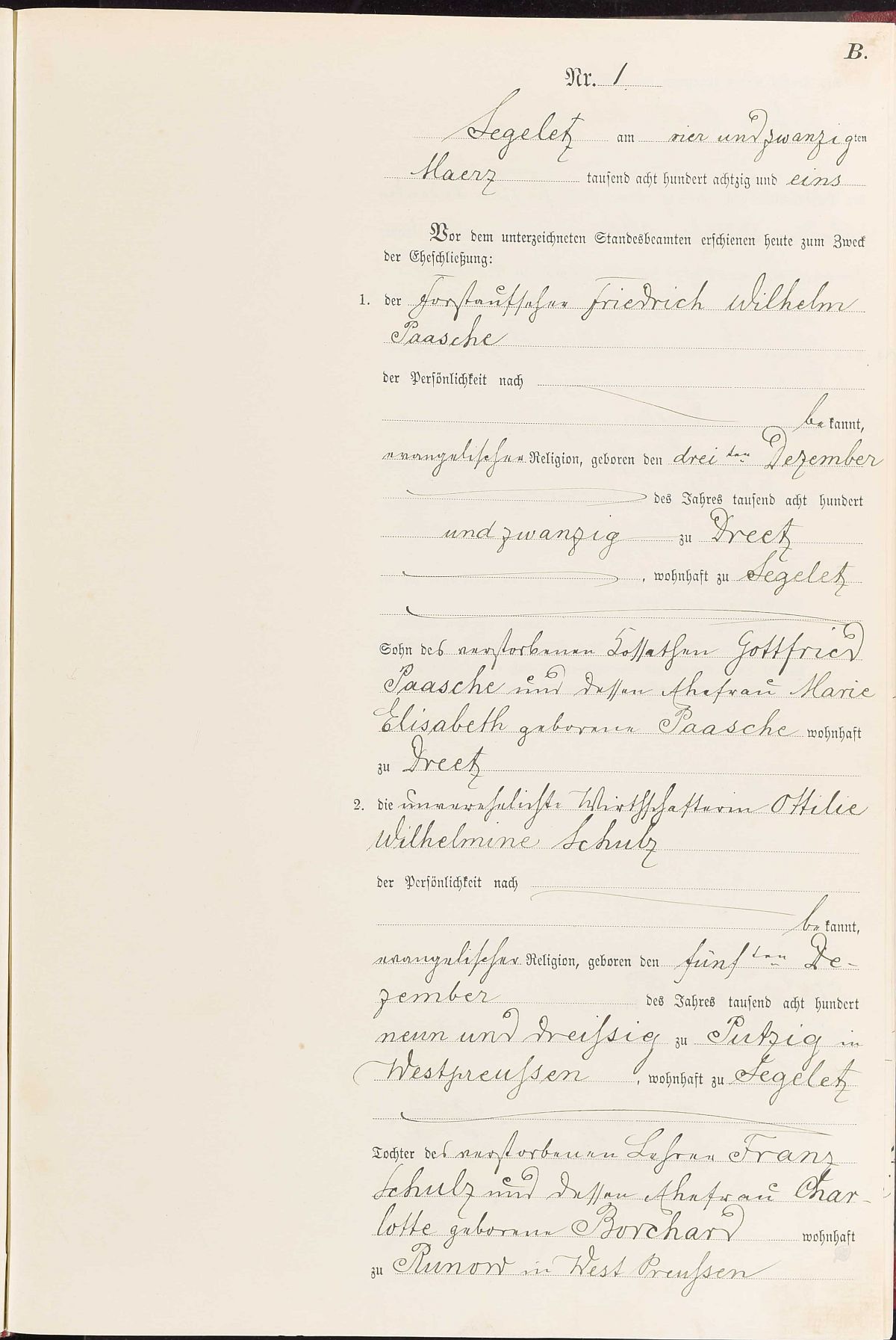 Quelle: Heiratsregister Nr. 1/1881 Standesamt Segeletz