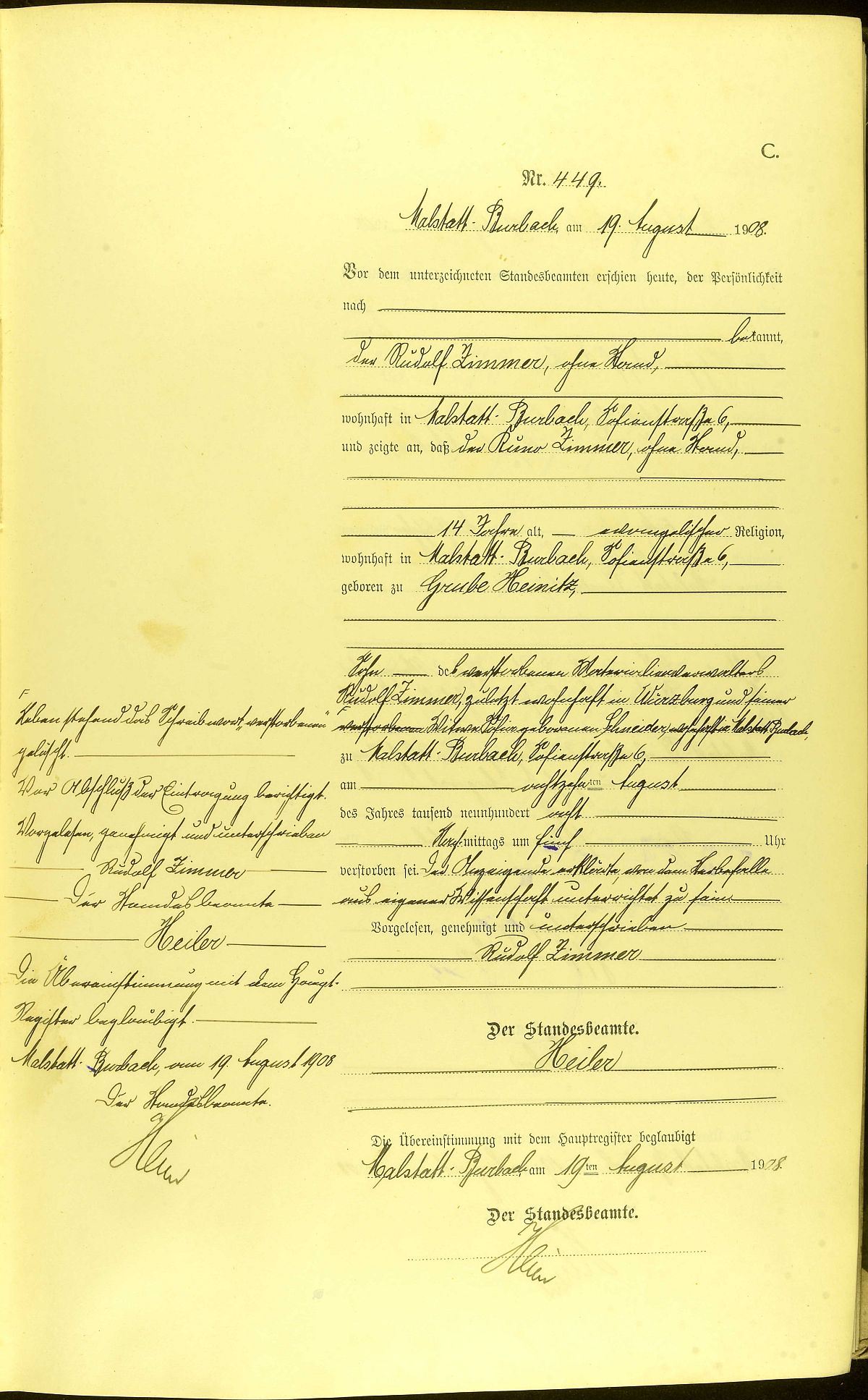 Quelle: Sterberegister Nr. 449/1908 Standesamt Malstatt-Burbach