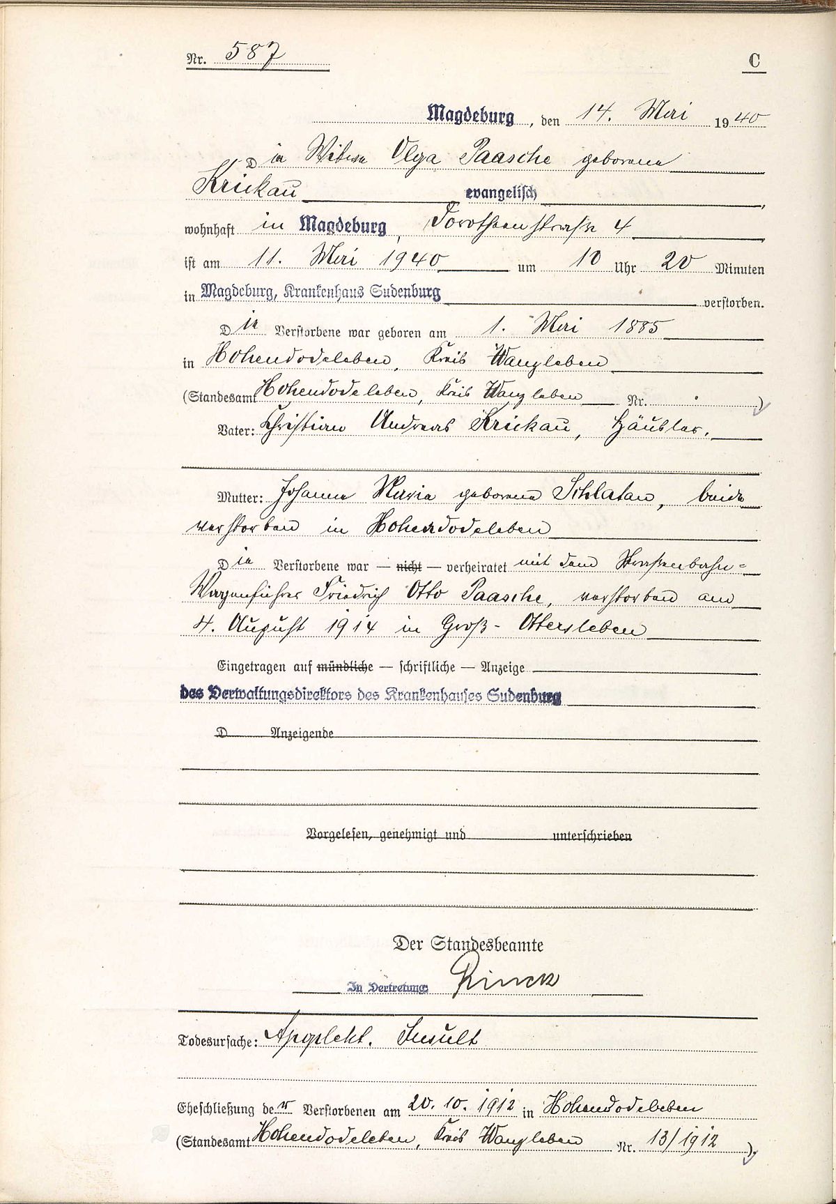 Sterberegister Nr. 587/1940 Standesamt Magdeburg