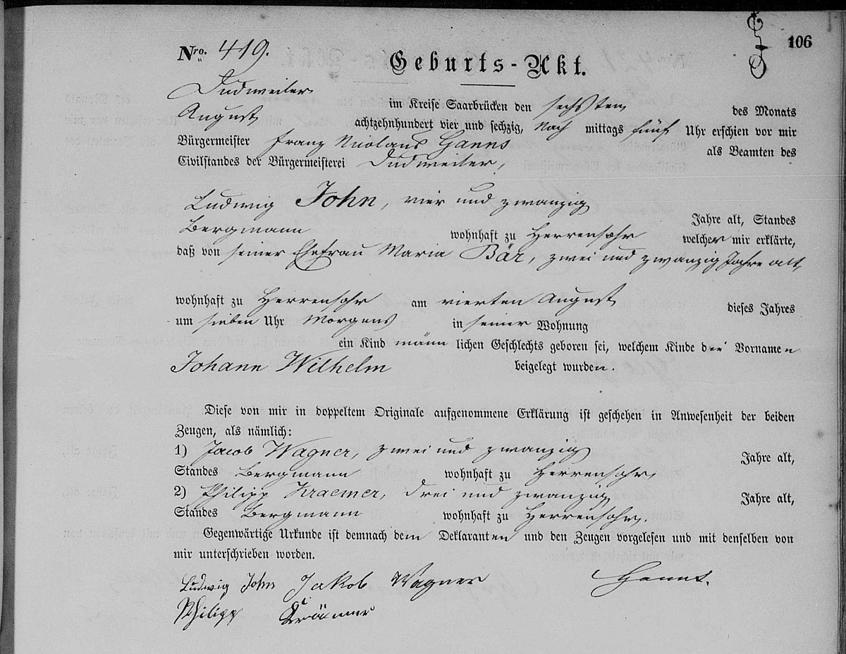 Quelle: Geburtsregister Nr. 419/1864 Zivilstandsregister Dudweiler