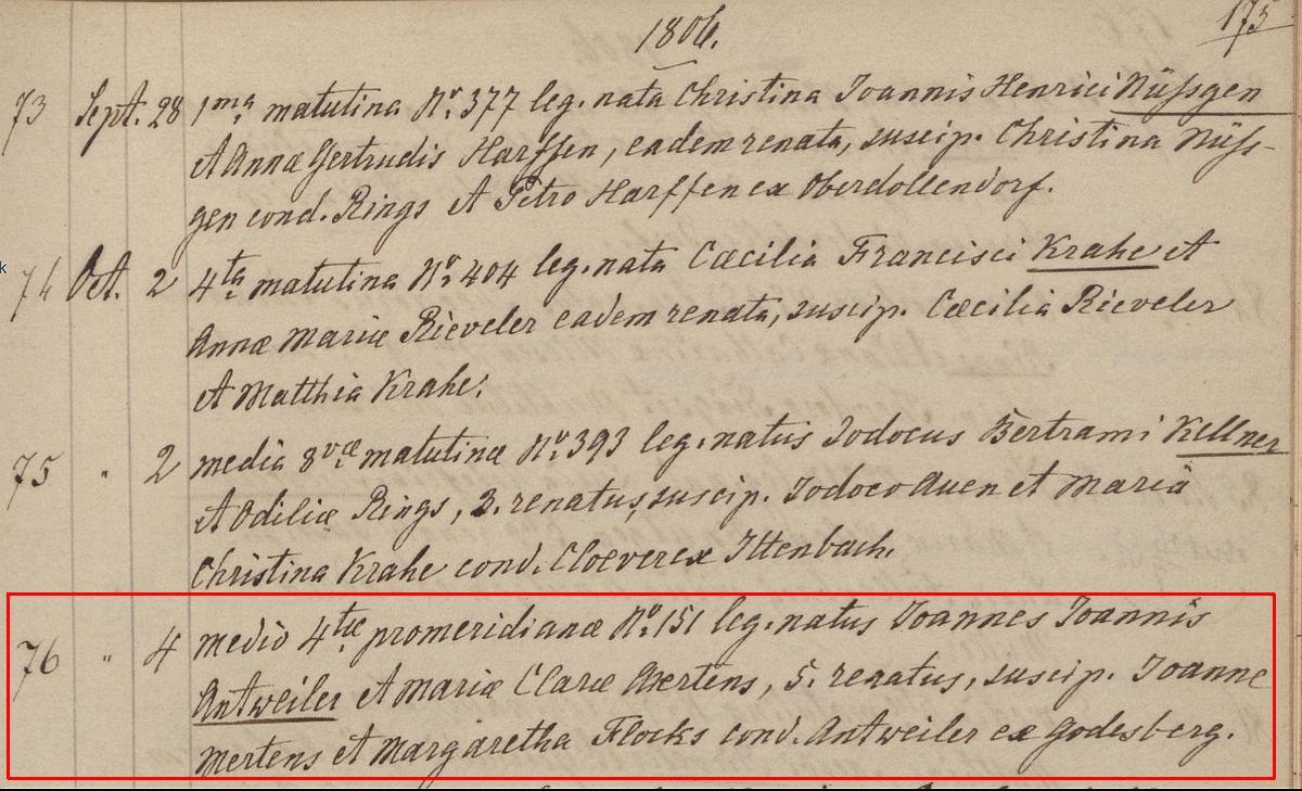 Quelle: Taufe Kirchenbuch Seite 175 des Jahres 1806 in der katholischen Kirche St. Johann Baptist zu Honnef