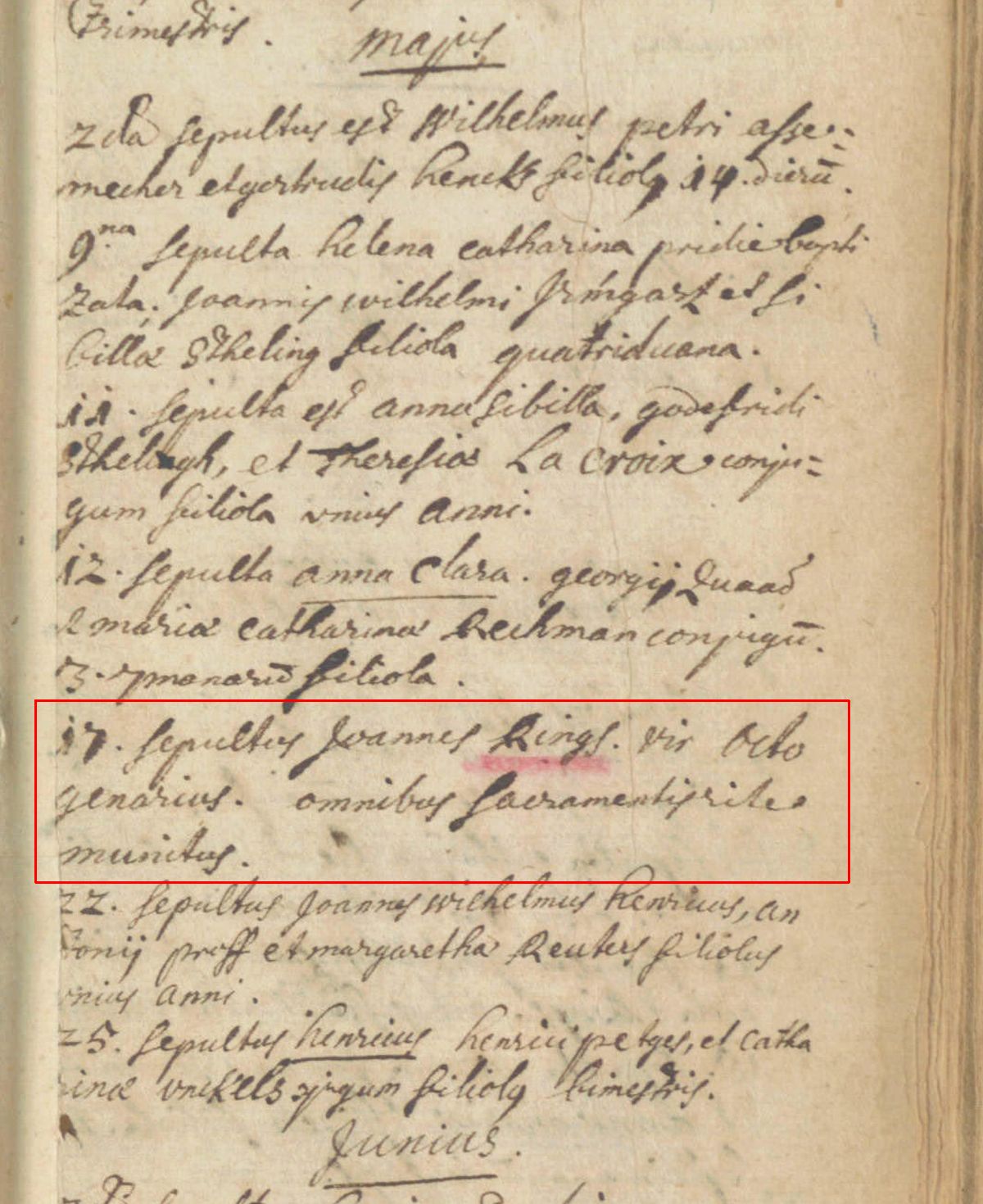 Quelle: Sterbeeintrag Kirchenbuch Seite 54 des Jahres 1718 in der katholischen Kirche St. Johann Baptist zu Honnef