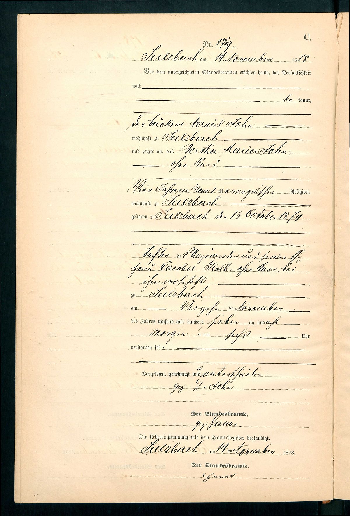Sterberegister Nr. 179/1878 Standesamt Sulzbach