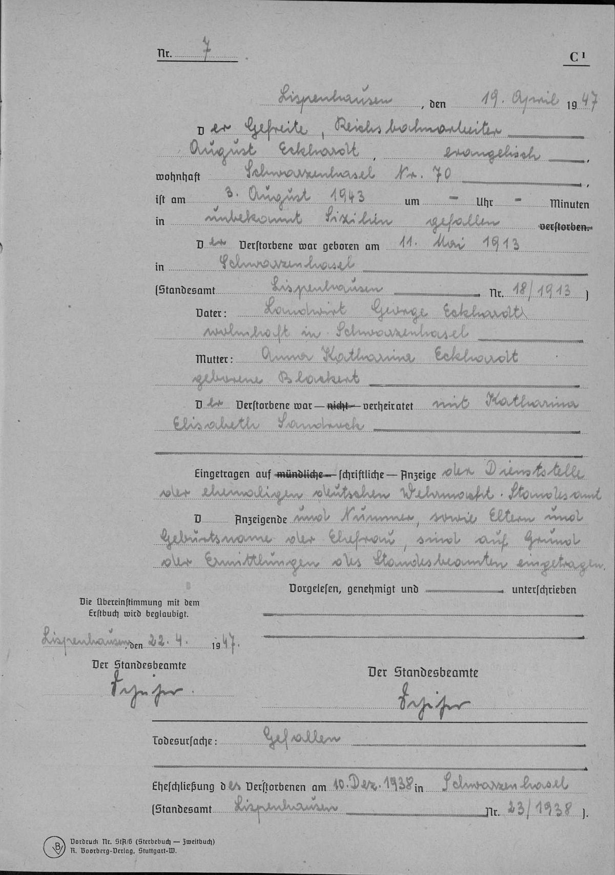 Heiratsregister Lispenhausen Nr. 23/1938