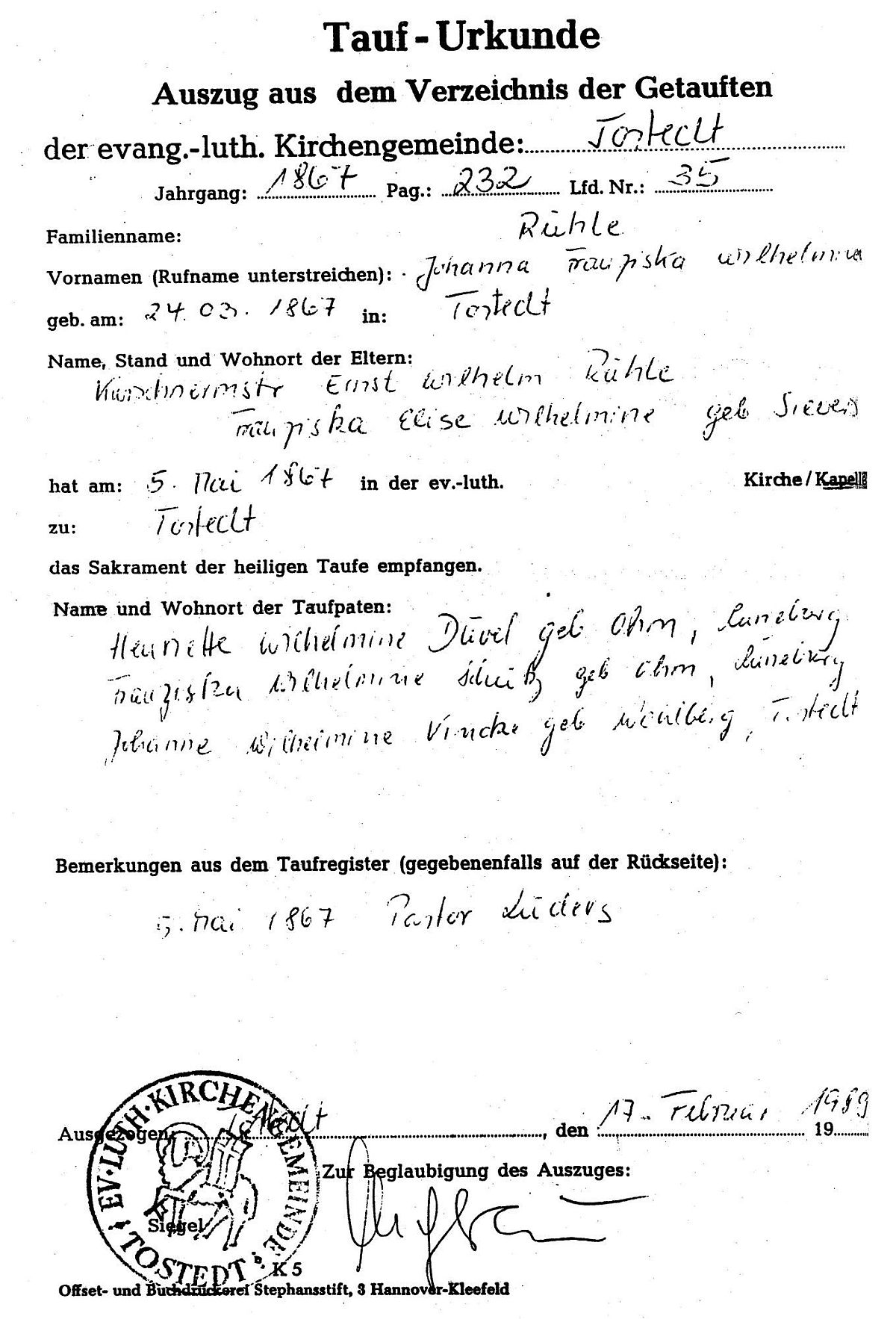 ~ 05.05.1867 Tostedt/Harburg, evang.-luth. Kirchengemeinde