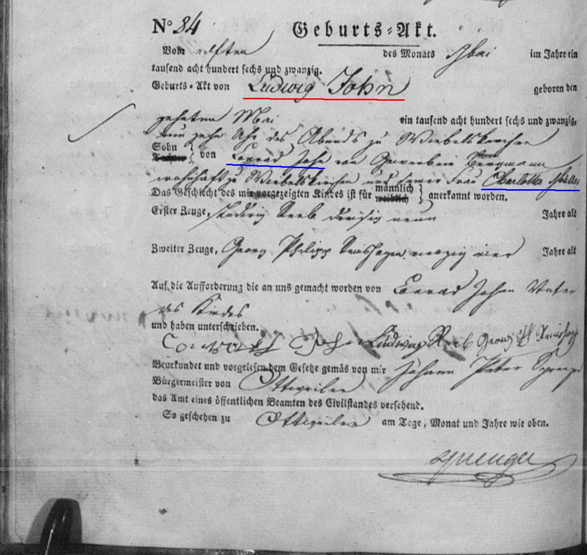 Quelle: Geburstregister Nr. 84/1826 Zivilstandsregister Ottweiler