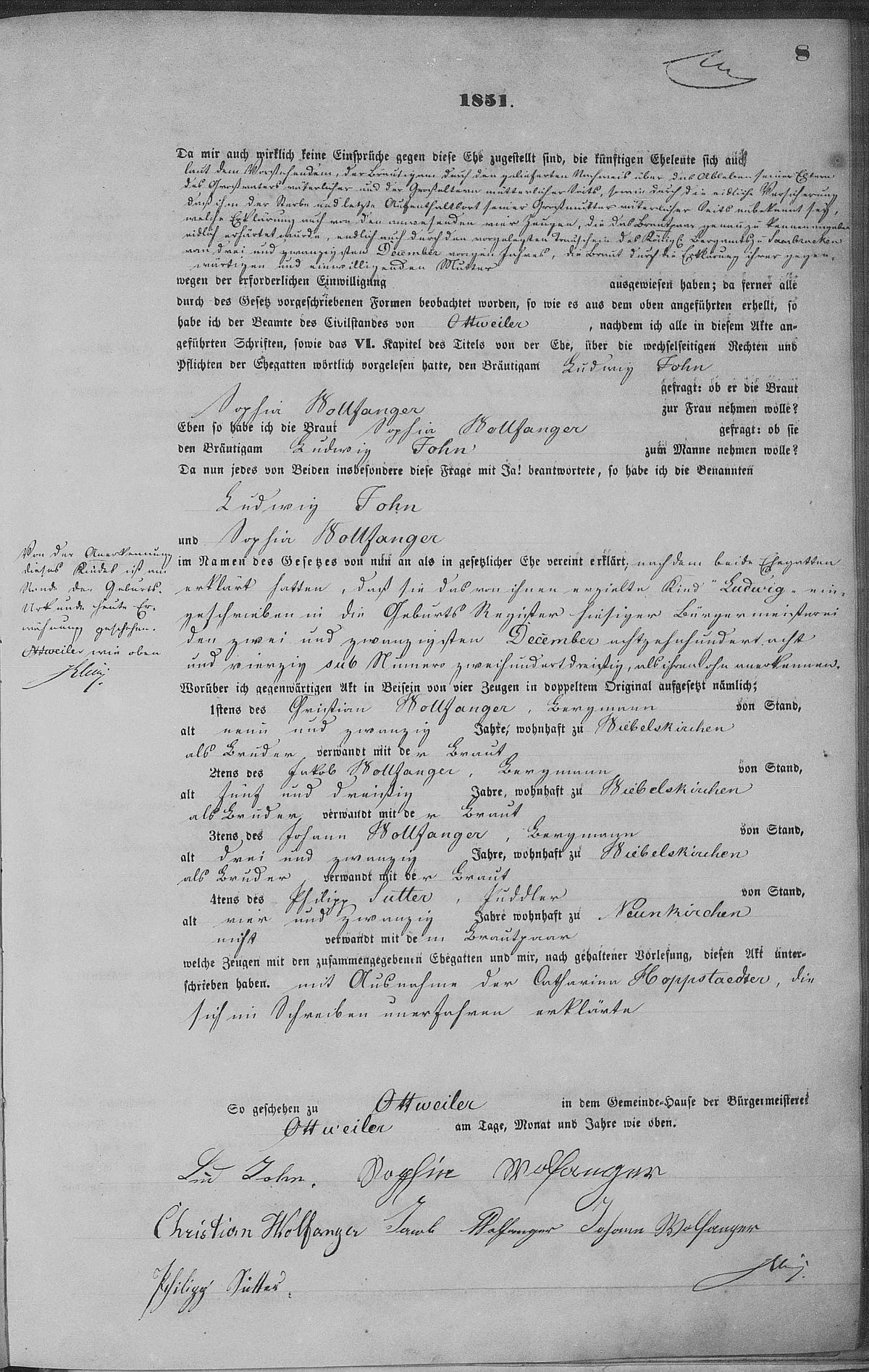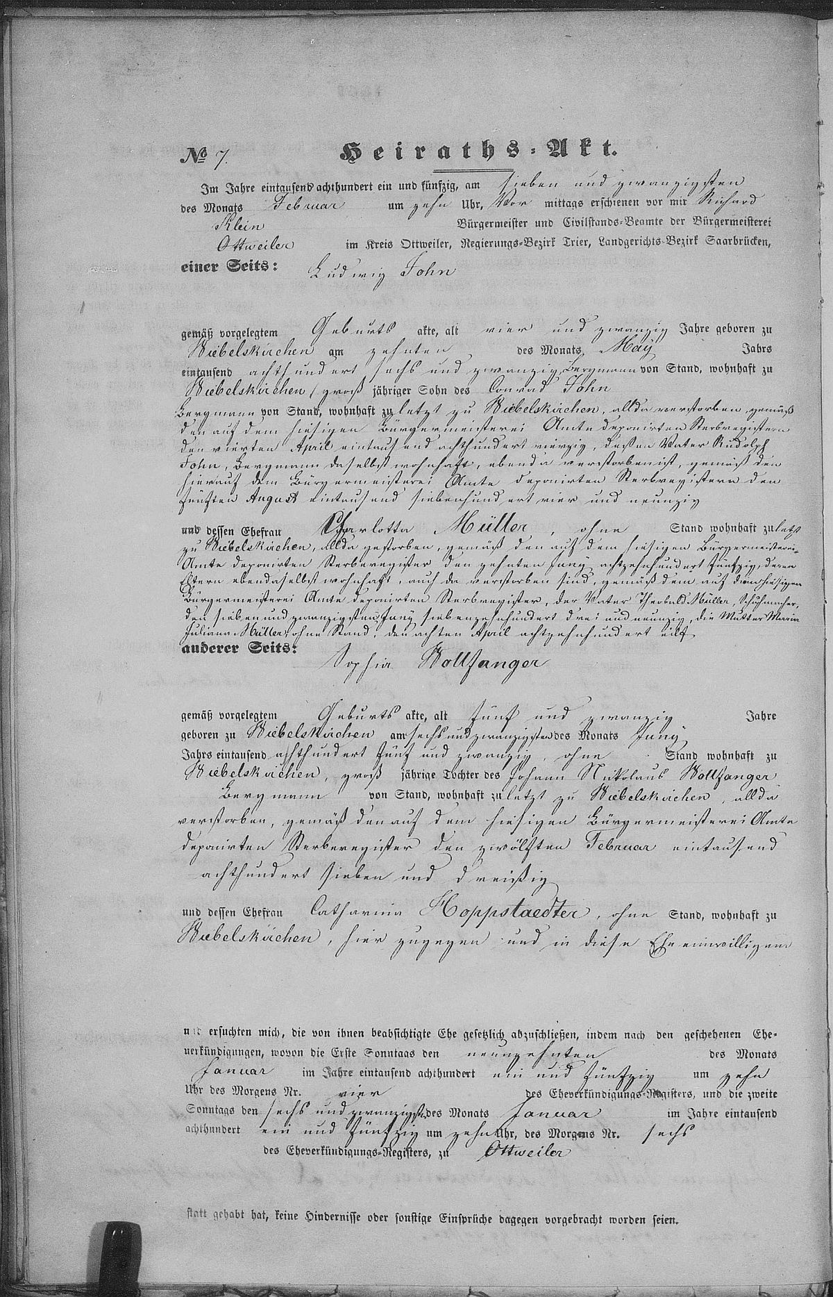 Heiratsregister Nr. 7/1851 Zivilstandsregister Ottweiler