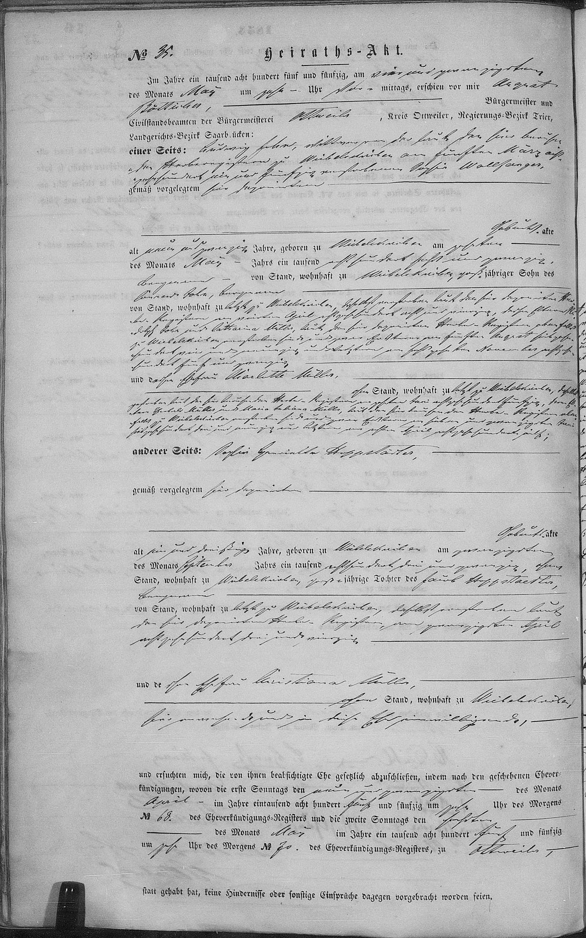 Heiratsregister Nr. 35/1855 Zivilstandsregister Ottweiler