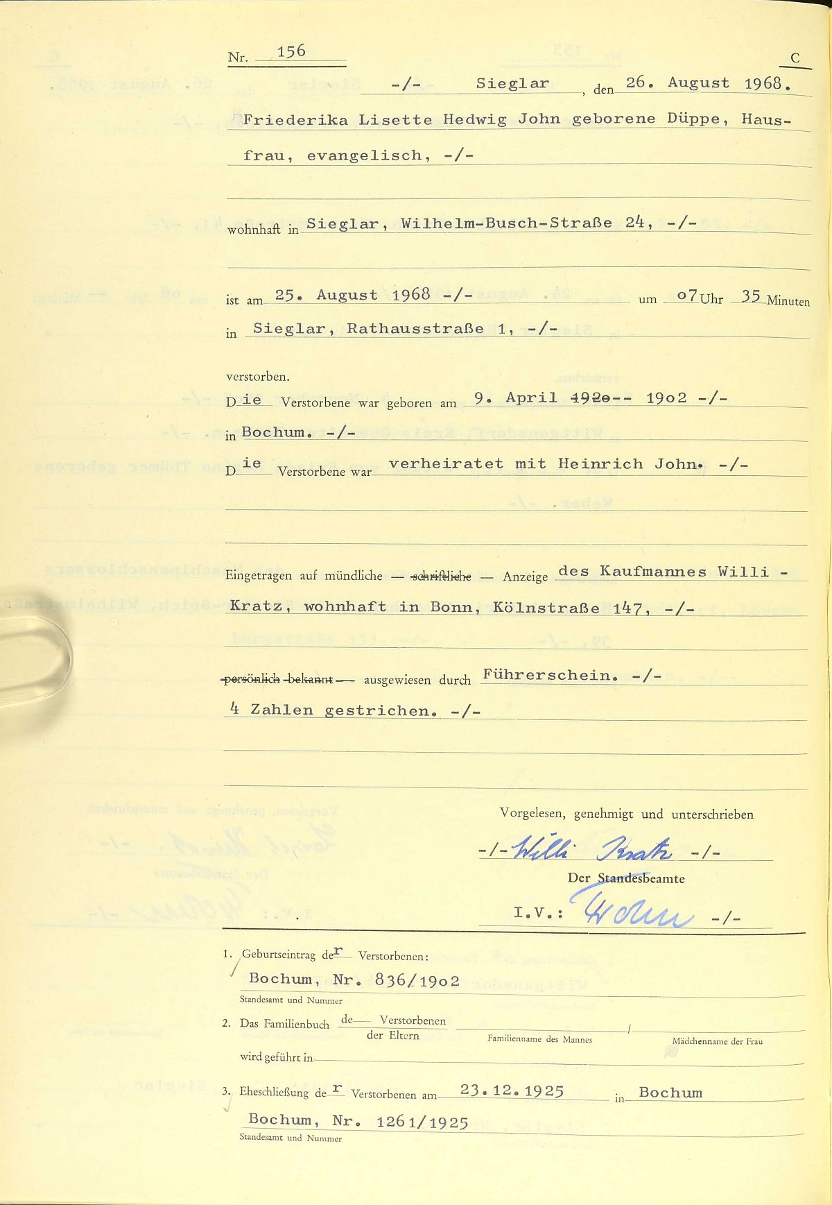 Sterberegister Nr. 156/1968 Sieglar (heute Troisdorf-Sieglar)