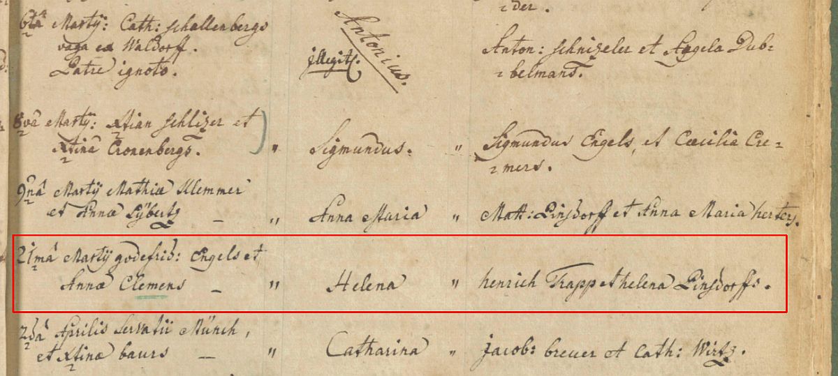 ~ 21.03.1784 Alfter, Regierungsbezirk Köln, St. Matthäus, Taufpaten: Henrich Trapp und Helena Pinsdorf