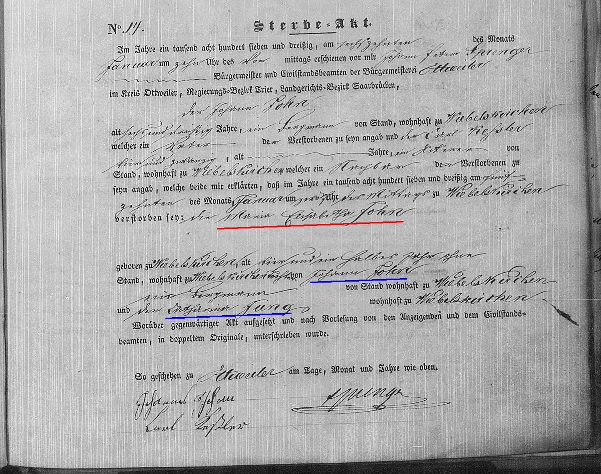 Sterberegister Nr. 14/1837 Zivilstandsregister Ottweiler