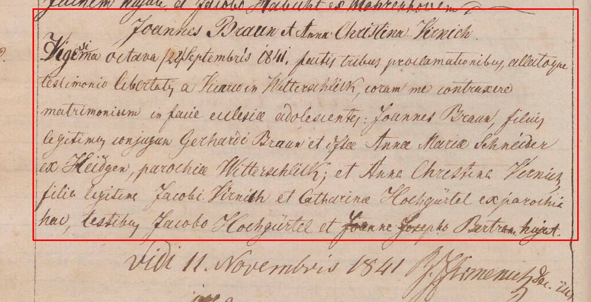 Quelle: Traueintrag Kirchenbuch St. Petrus Lüftelberg aus 1841auf Seite 324 (Trauzeugen: Jacob Hochgürtel und Joanne Joseph. Bertram)