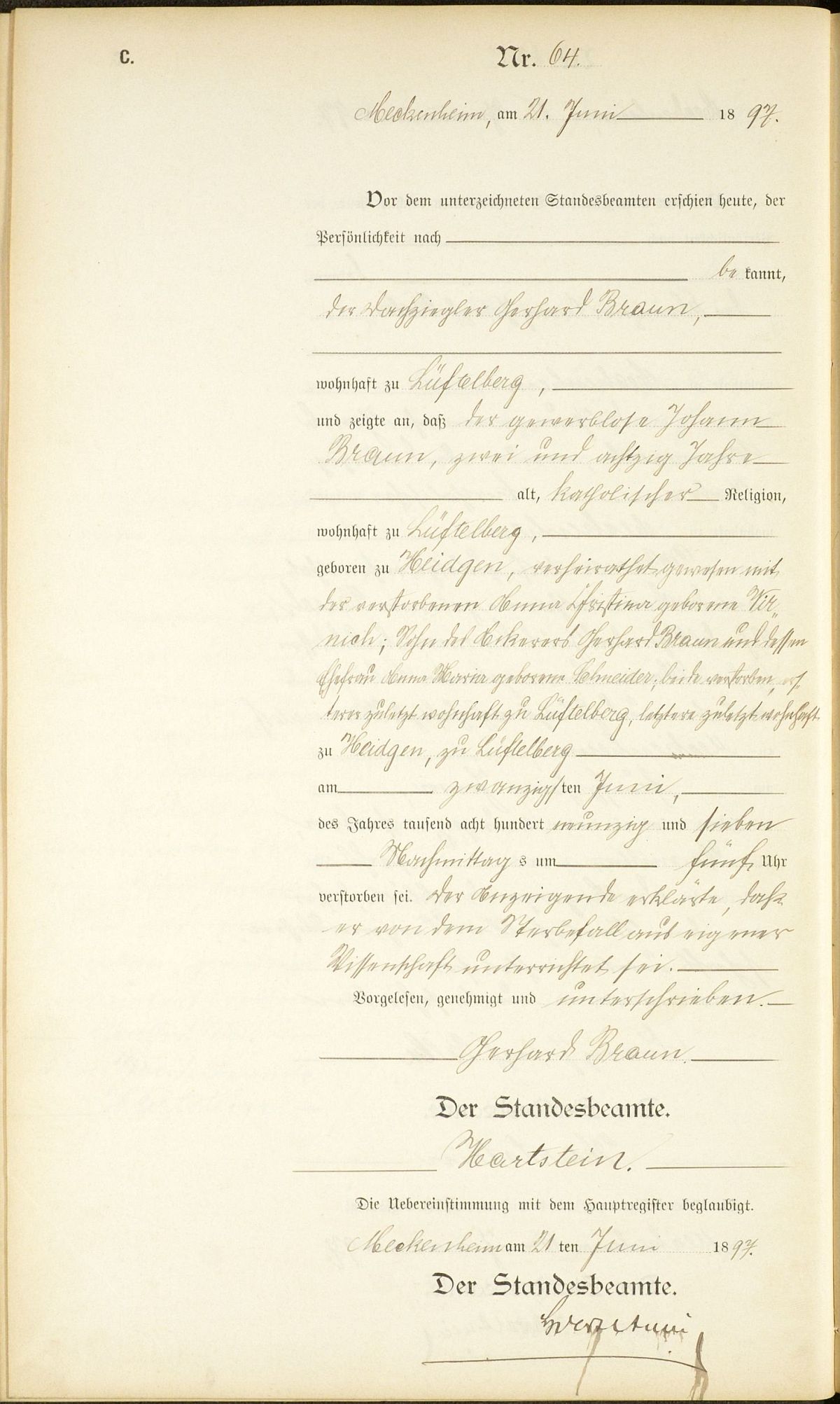 Sterberegister Nr. 64/1897 Standesamt Adendorf/Meckenheim