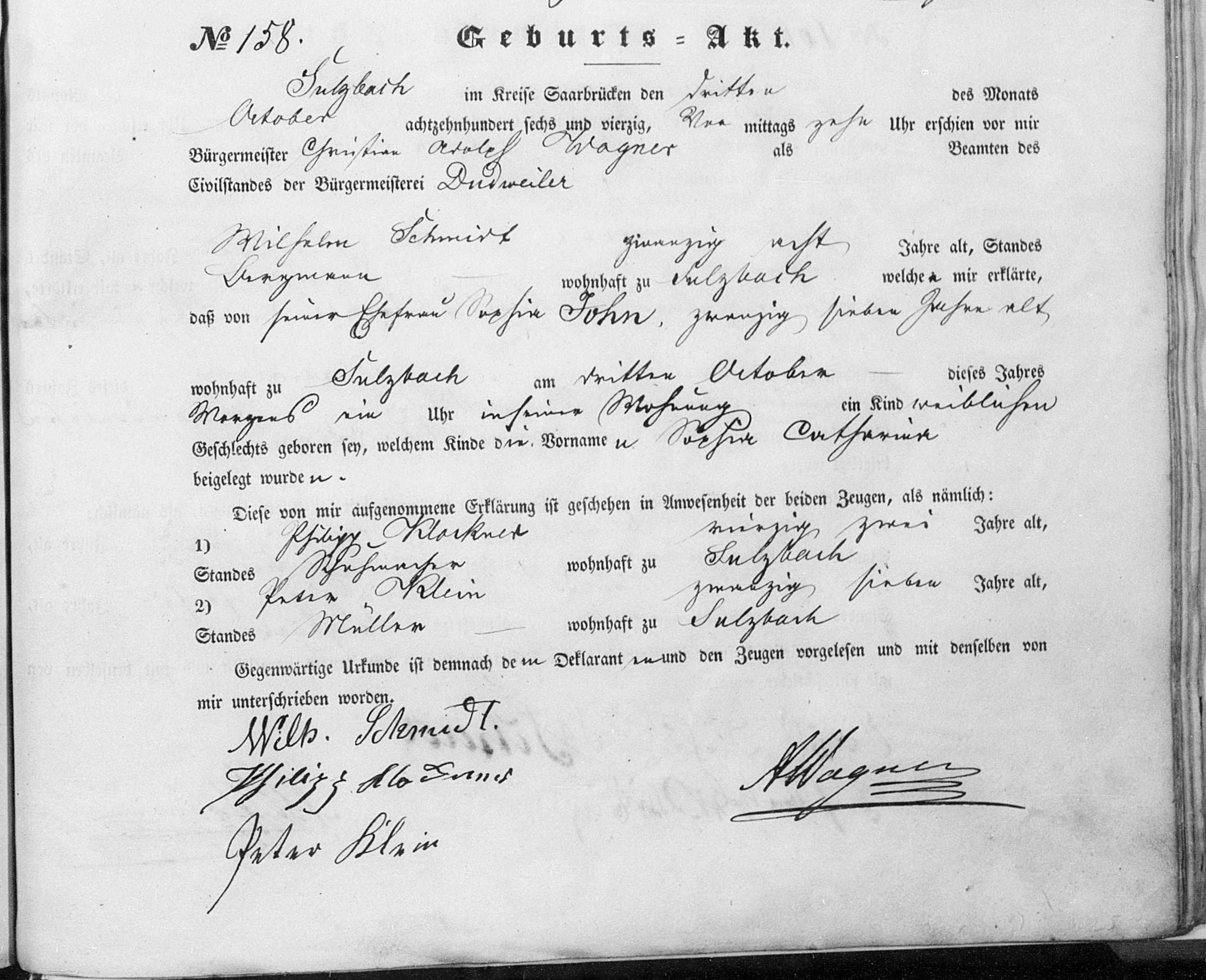 Quelle: Geburtsregister Nr. 158/1846 Zivilstandsregister Dudweiler
