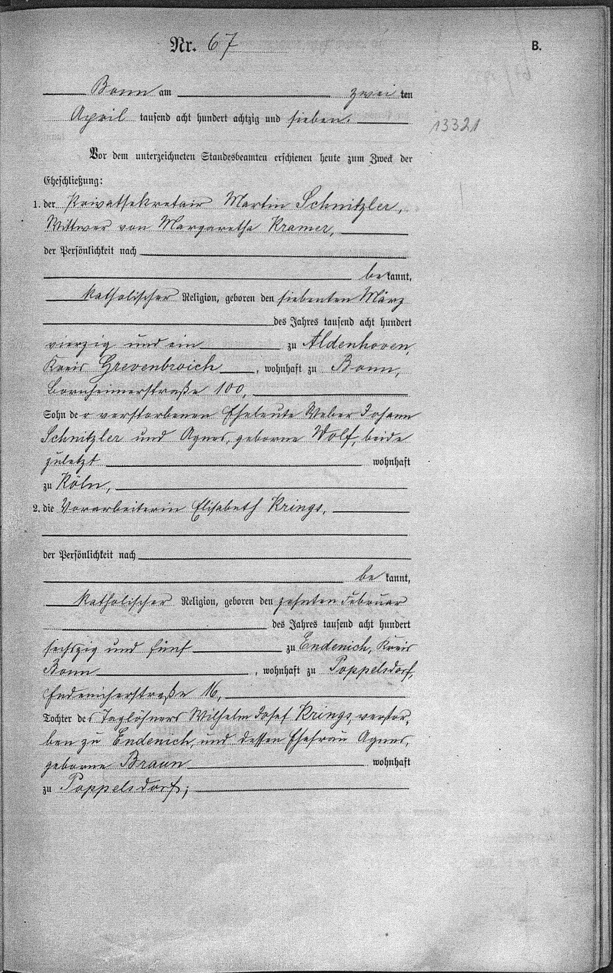 Heiratsregister Nr. 67/1887 Standesamt Bonn (Trauzeugen: Andreas Schüller und Lucas Fritz)