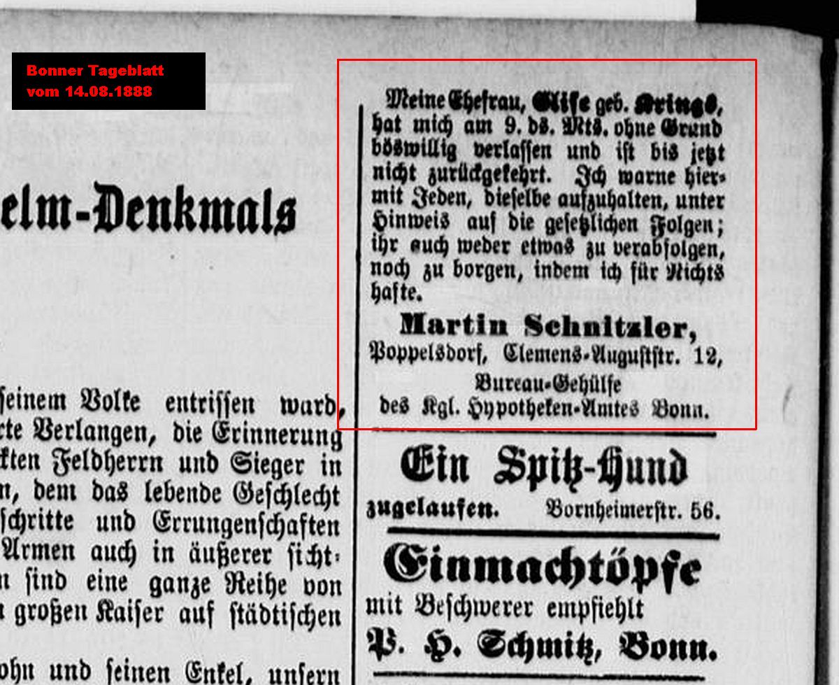 Zeitungsausschnitte "Bonner Tageblatt" vom 14.08.1888 und 15.08.1888
