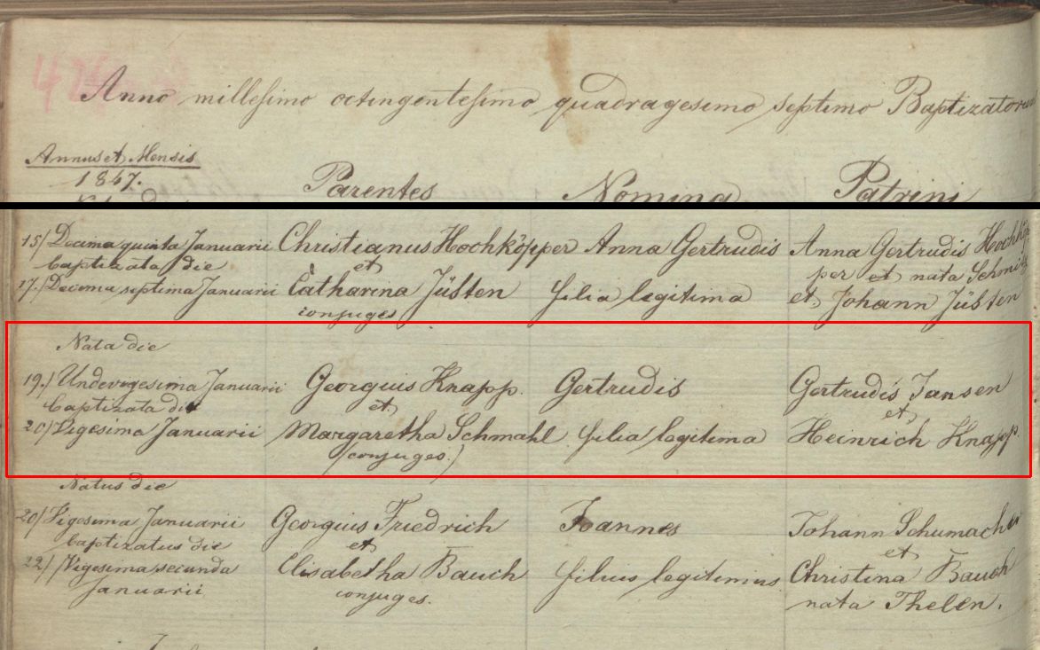~ 20.01.1847 Bonn, Stiftskirche, Taufpaten: Gertrud Jansen und Heinrich Knapp