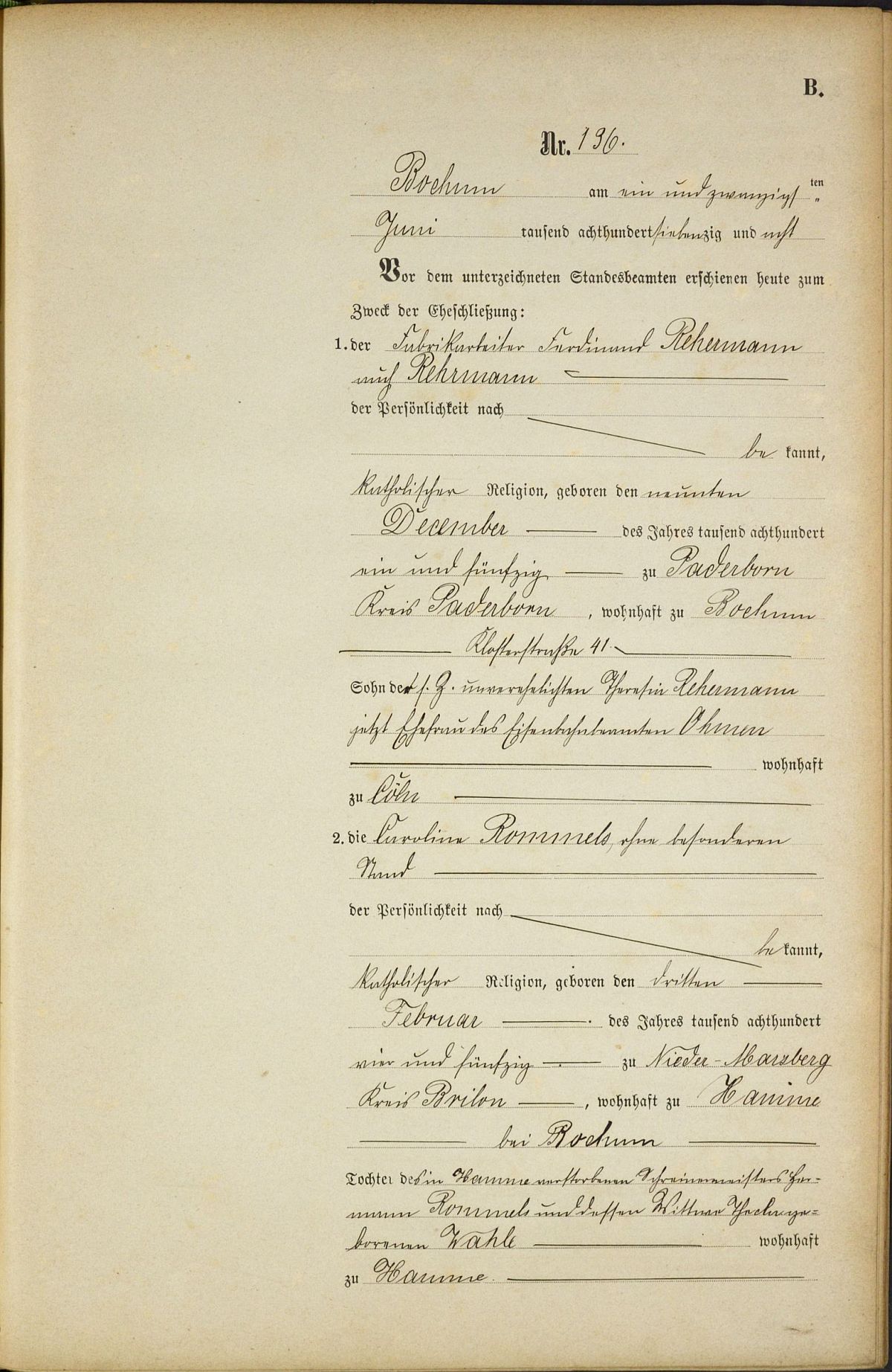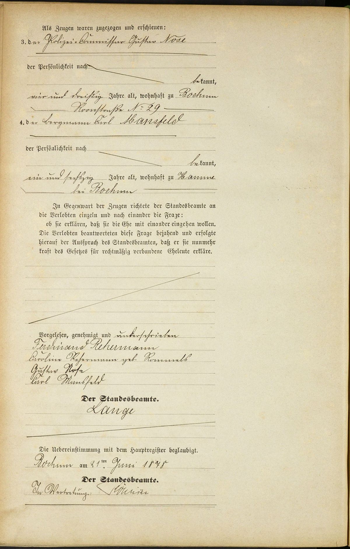 Quelle: Heiratsregister Nr. 196/1878 Standesamt Bochum-Mitte