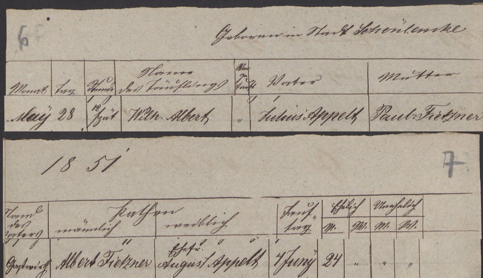 Vater: Julius Appelt Mutter: Pauline Appelt geb. Fietzner Geschwister: Auguste Emilie Appelt Sophia Wilhelmine Amalie Appelt Todgeburt Appelt
